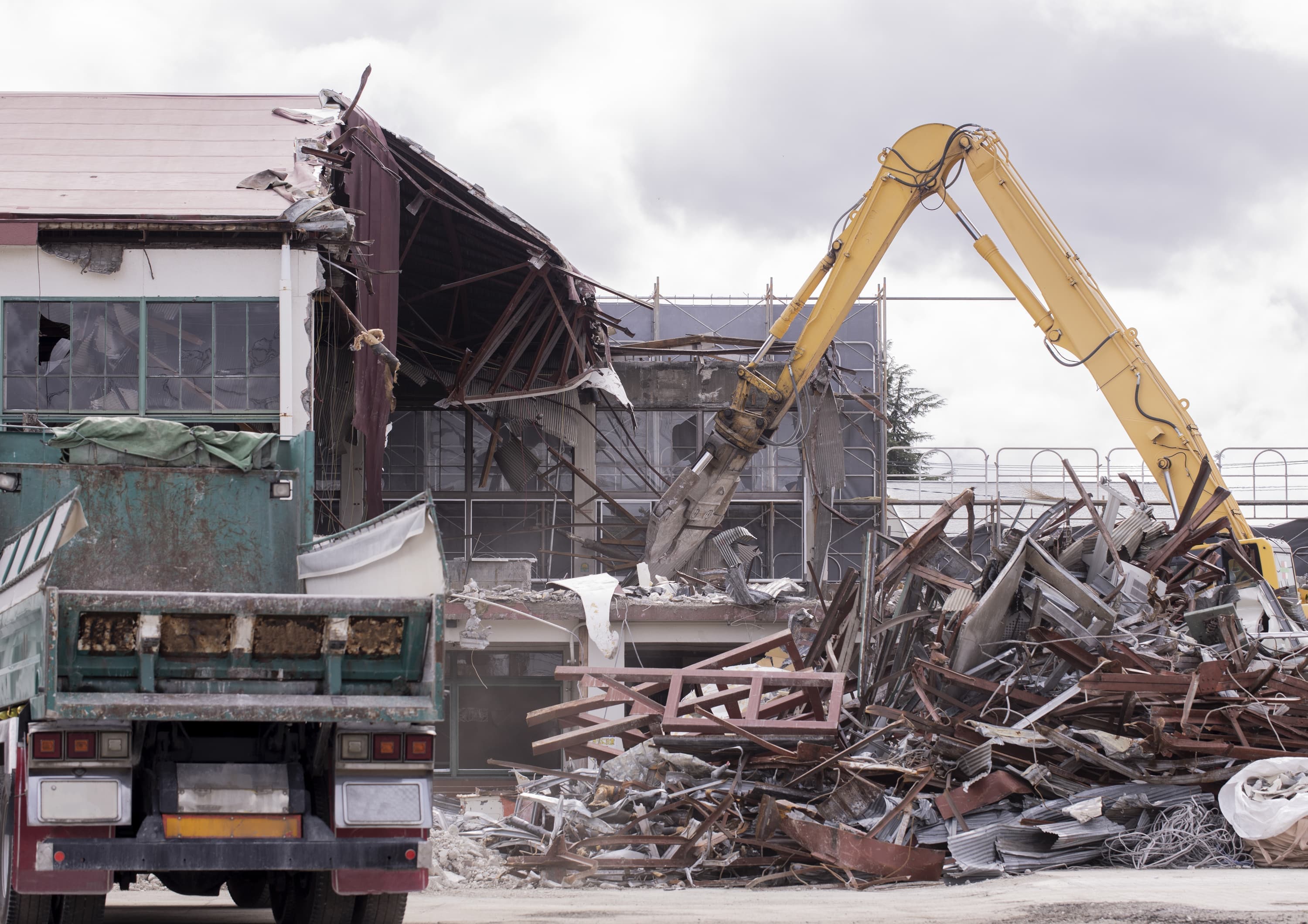 多くの廃棄物が発生する解体工事。重機・資機材などの搬出入や、工事に伴い現場で発生する多量の廃棄物を処分場に運搬するため、多数の車両が出入りします。1日でも早く工事を終わらせるために、搬出入の頻度が高まる一方で、安全管理の範囲は現場内に重点が置かれがちです。弊社では周辺への交通影響を重視。警備員の配置を関連法令より厳格に行うなど安全施工を行います。