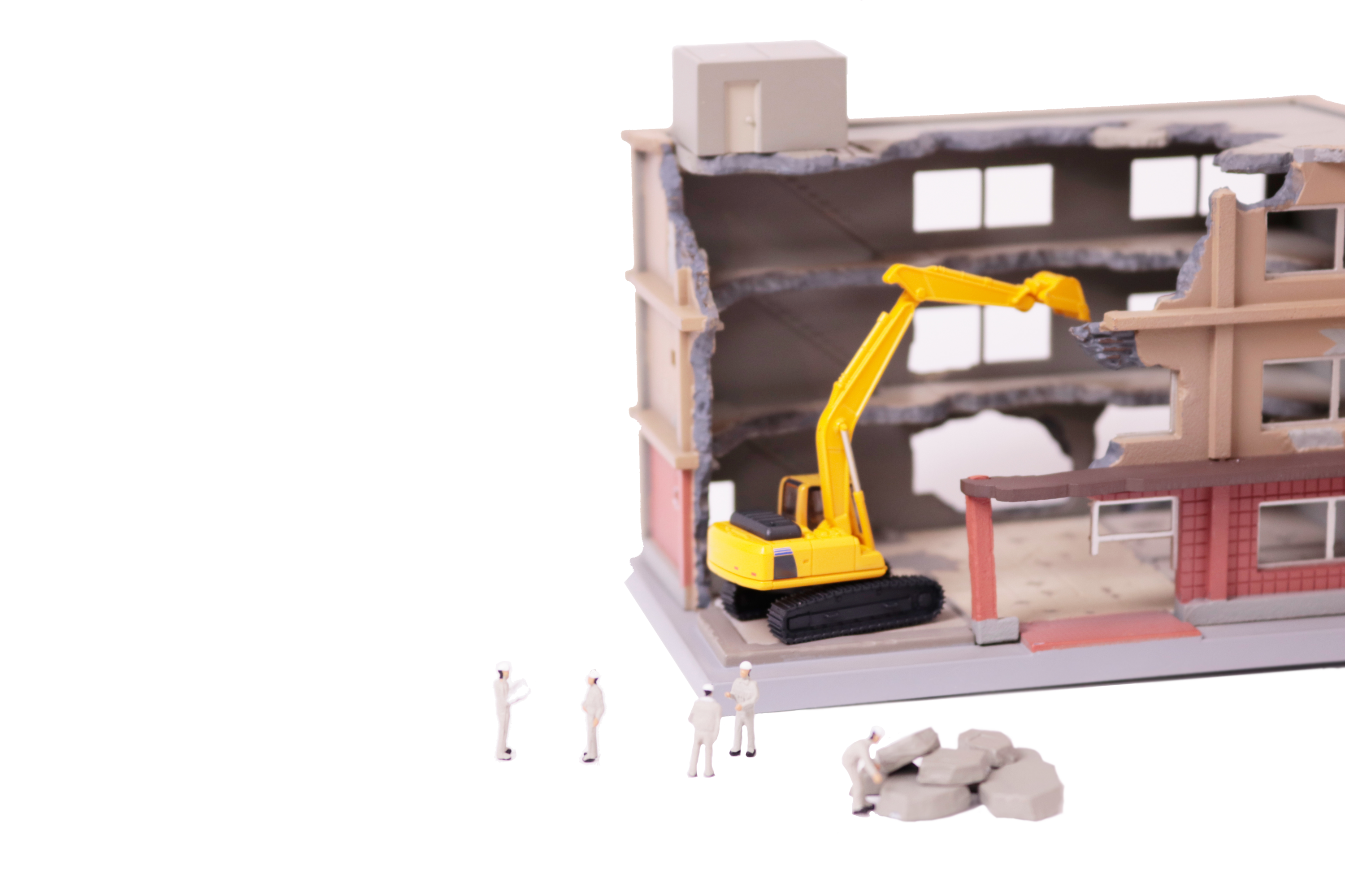 解体する建物の構造を分析、解体手順を作成します。大規模な構造物では特に重要な手順です。また、パネルや防音シートにより現場の養生(囲い)を行い、粉塵が飛散しないよう充分な放水を行うなど、近隣への影響を小さく留めるよう配慮も行います。