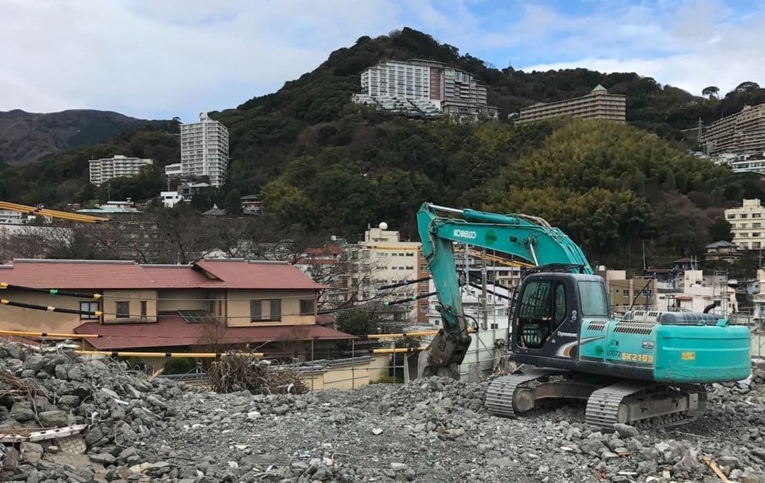 傾斜地が多く、限られた平坦地に建物が集中している熱海の市街地ですが、安全施工に留意しながらおよそ6か月で施工いたしました。解体面積は3棟のうち1棟約920坪を施工、宿泊施設として利用されていたRC造の建設物でした。